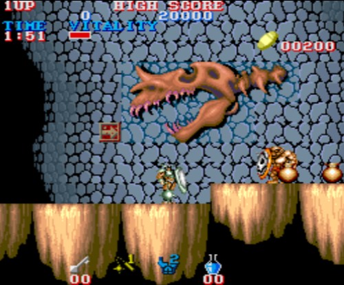 1987年由CAPOM公司制作的动作过关游戏·该游戏可以说是魔界村游戏的前身·游戏主角受到攻击时盔甲会损坏最后只剩下一条裤衩的设计后来也被运用到魔界村上·游戏中主角是用链锤作为武器攻击敌人,每次挥动链锤都会同时向前方发出3方向的飞刀,当玩家在游戏中解救被石化的人质就有机会进入商店购买道具和武器,在商店里可以买到最好的武器和防具(金色盔甲,价钱2400元),但当然必须靠游戏中多捡一些金币来换取了·游戏的最终BOSS是黑龙,在最后一关地上经常会出现一些蓝色的火焰,如果你不小心碰到就会让你的角色产生反方向操作,具体是你输入向前的指令人却往后退·黑龙的火球攻击是可以被链球的飞刀抵消的,关键是注意黑龙的行动和不要中了会逆操作的蓝色地火·经过不懈的努力,玩家终于击败了黑龙,黑龙也在玩家强大的火力下化成了一堆骷髅·该游戏和多地方都被后来的CAPCOM知名超高难度游戏魔界村所借鉴,该游戏有一定难度·适合喜欢挑战高难度的玩家